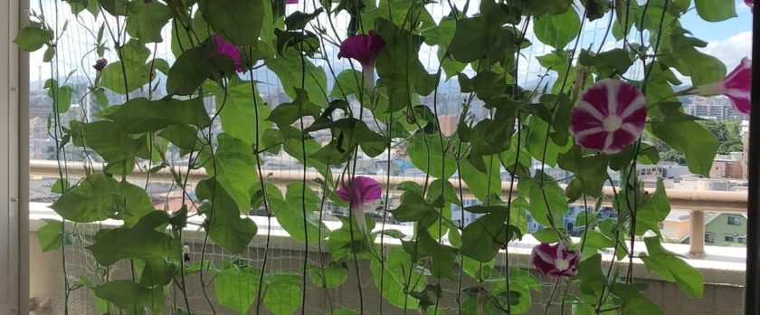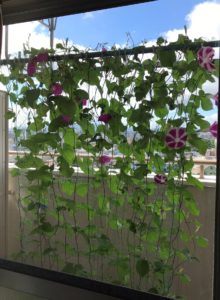 我が家では、少しでも電気代を節約するため、南側のベランダで朝顔のグリーンカーテンを育てています。
